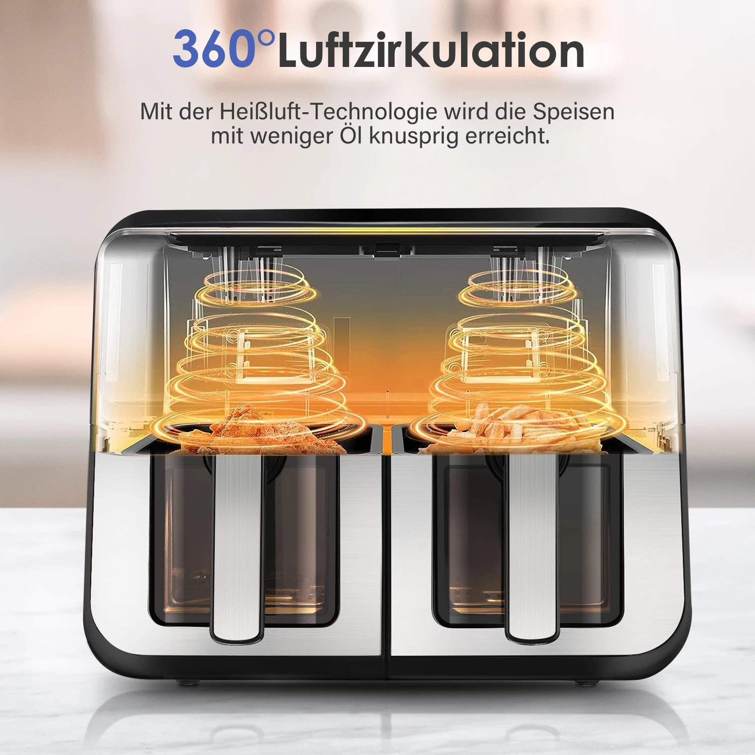 Product Name: Double door air fryer – RA930DSV -4.5L+4.5L (9L) -2400W (80-200 ° C) – preset 8 modes – ABS heat-resistant shell+front stainless steel veneer – touch button+60 minute timer – window version – black