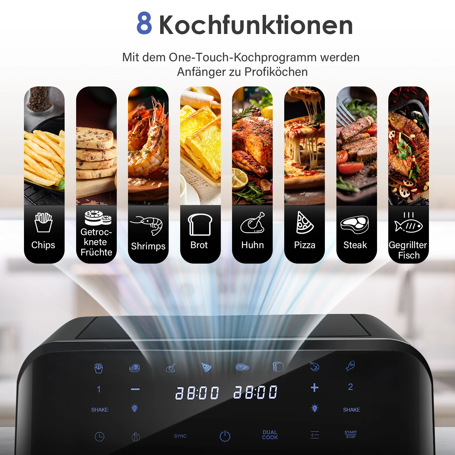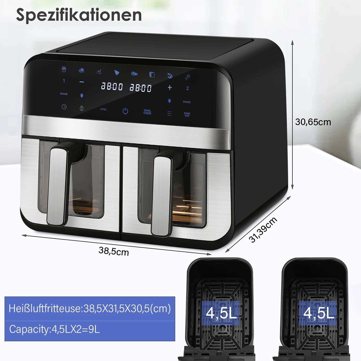 Product capacity: 4.5L+4.5L; Temperature range: The temperature adjustment range for dried fruit mode is 30-60 ° C. while the temperature adjustment range for other modes is 80-200 ° C; Mode: preset 8 modes